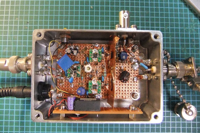 調整は最初に後段の計装アンプのバランスを調整。T1以前を取っ払い、R8両端をショート、そことGNDとの間に50Ωの抵抗を接続してそこに方形波を同相入力する、あるいはVNAで測定する。出力に表れる信号が最小になるよう、CV1,VR2で調整する。VR2は全帯域に対して影響するので、まずVR2で低周波のCMRRが向上するように、具体的には出力レベルが最低になるように調整する。最後に出力が0VdcになるようにVR3で調整する。