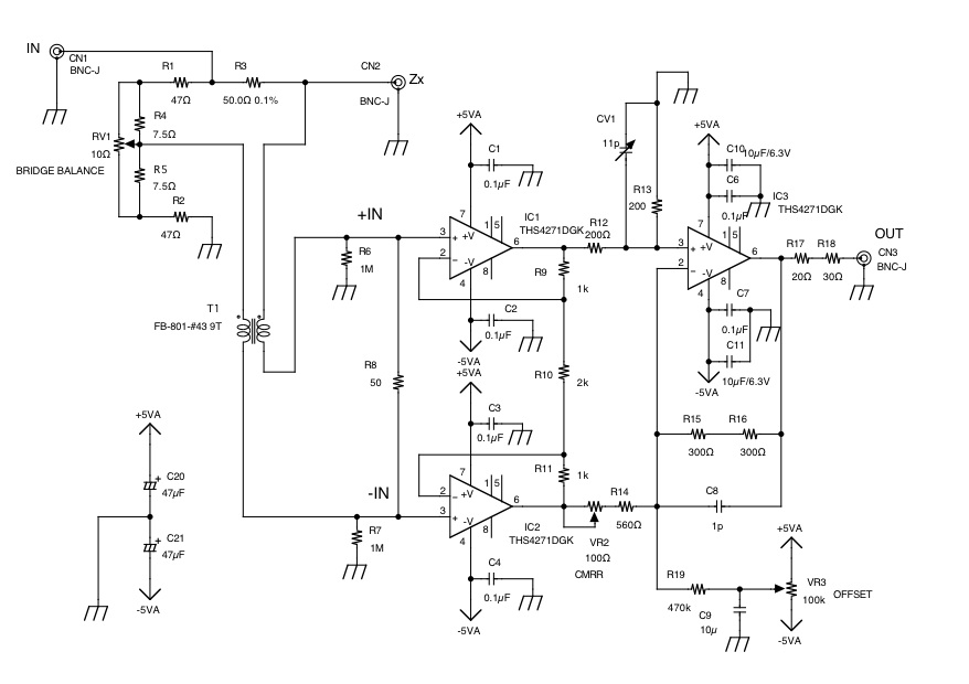 回路構成は、通常のリターンロスブリッジ(ただしボリュームでバランス調整可能としたもの)に、コモンモードチョークと計装アンプ(差動アンプ/バランス入力-アンバラ出力)を組み合わせたものである。