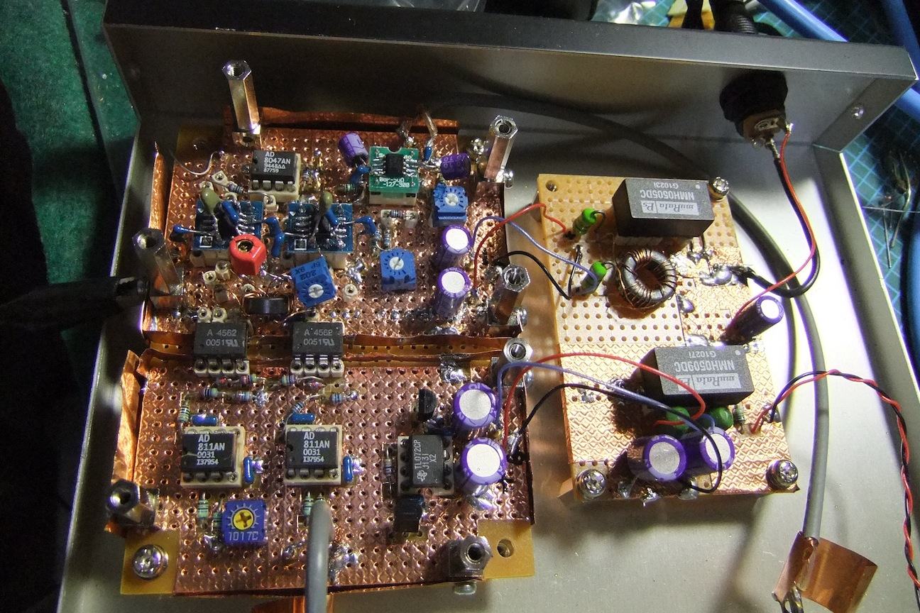 入力はシングル入力を差動にして、AVAGOの広帯域アナログフォトカップラHCPL4562を二個、フォトカップラのLEDをフィードバックループ内に入れてドライブする。Vfの温度変化の吸収をしている。LEDの電流範囲は入力電圧が±1Vで6.5mAを中心におおよそ0〜13mAとなるように設計してある。規格上、平均12mAの電流まで耐えられるフォトカップラなので、ACで使うことを前提とすればもう少し電流を増やしても良いかも知れない。このフォトカップラの稼働時の耐圧は1.414kV。これよりも使用しているDC-DCコンバータ(MURATAのNMHシリーズ)の耐圧の方が低く、一つに付き60V(連続)となっている。二つ直列になるので、両GND間は±120V、ただしDC電源入力までは±60Vの耐圧、となる。(つまりもっと耐圧がほしい場合にはDC-DCコンバータを交換する必要がある。)