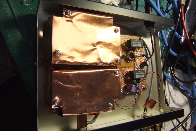 この様に、アイソレーションされた回路それぞれを別のシールドで覆う。0.1mmの銅板を使った。隅は角形支柱に六角支柱を立てて、それに蓋のシールド板をつける。シールド板が無い状態ではかなりSWノイズが飛び込むが、シールド板をつけると減る。
