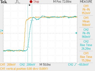 次に、入力から、広帯域のFG(帯域10MHz以上)にて±0.5V程度の方形波を入力し、出力波形をオシロ(入力インピーダンス50Ω終端で)にて観測する。