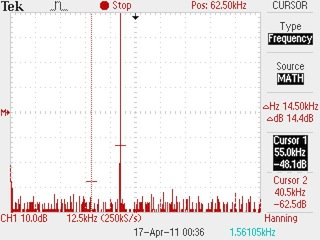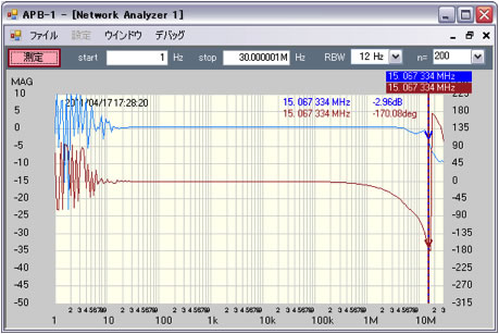 APB-1のVNAで測定した周波数特性。高域にちょっとピークが出ている。-3dBで≒15MHz。もう少し調整するとなくせるが、これで十分使える。FFTをすると、SWノイズが乗っている。これは是非下げたいが、当面このままでも使える。