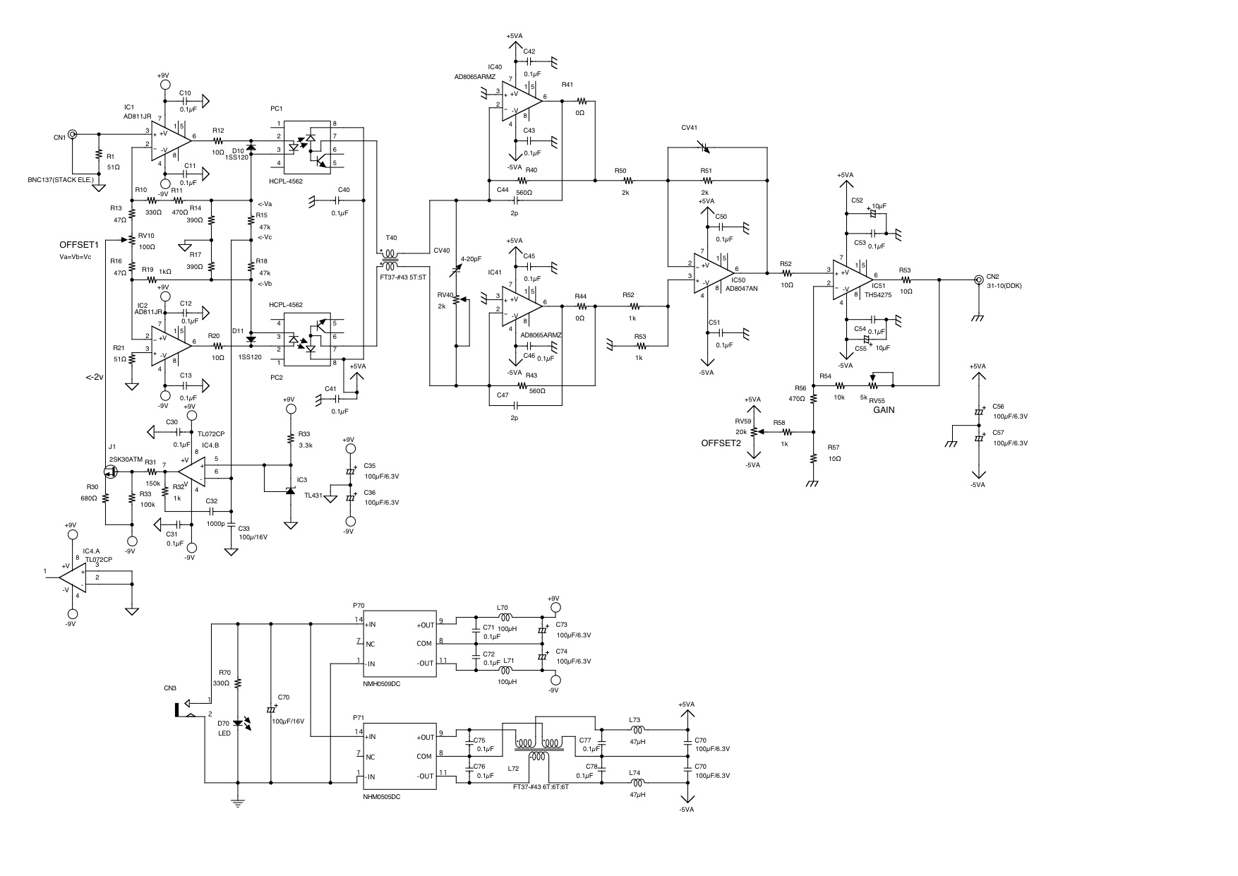 フォトダイオードは、AD8065(IC40,41)でI/V変換され、差動合成(AD8047/IC50)してシングルエンドとする。フォトダイオードとI/Vの間にコモンモードチョークを入れる。数dB程度、高域のコモンモードの飛び込みが減る。フォトカップラでアイソレーションされていても、電圧的な飛び込みは完全に防げないのでこのようなチョークトランスと差動回路構成とした。