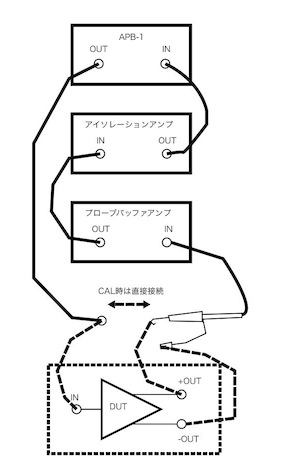 測定時の接続は下図。これでAPB-1とプローブバッファアンプとのGNDがフローティング(絶縁)となる。