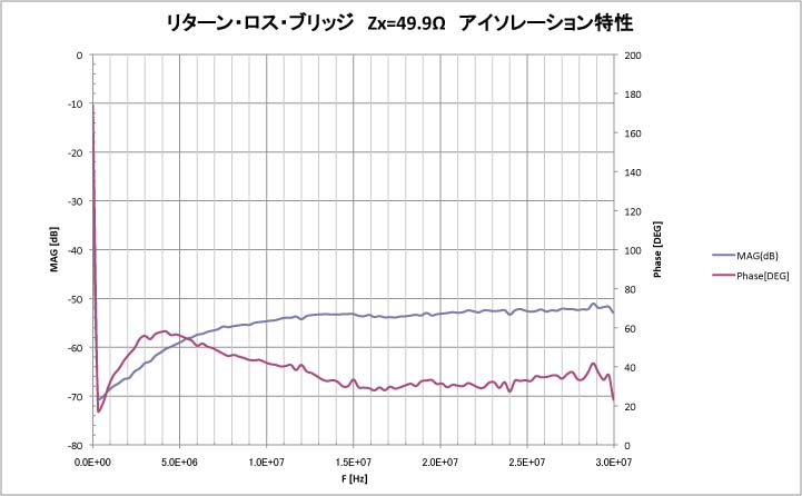ブリッジ構成を他のと同じ49.9Ωの抵抗を測定したデータ。高域で若干値が大きめになっているが、まぁまぁか。