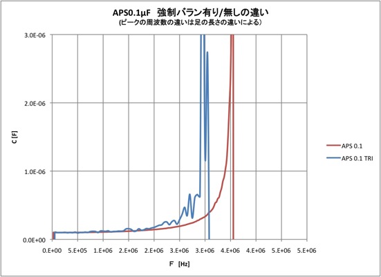 強制バランで測定したフィルムコンデンサ(ニッセイ電機・倦回タイプ APS 0.1μF)。ピーク周波数が違うのは、足の長さが違うためL成分の違いにより、自己共振周波数が変化したため。ピークの違いではなくて、TRIの方の測定値が暴れている点を見てください。。
