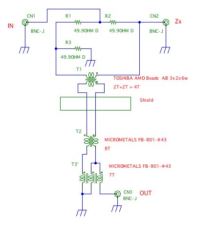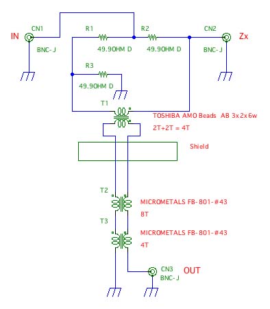 そもそも、これはブリッジである。図1でいえば、R1,R3、およびR2と被測定インピーダンスZxにつないだ抵抗Rxとがバランスし、ノーマルモードでの出力が0になるようになる。コモンモードの信号はバイファイラ巻のコアで取り除く。
