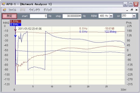 上記から、またちょっと改造し、いろいろやって、こういうのに落ち着いた。二つあるのは、オープン(無負荷)特性と、50Ωを付けたときの特性である。回路は伏せておく。