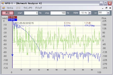 100Hz以下を拡大すると、だいたい25〜30Hz以下は精度が悪い。この低域の盛り上がりはレゾリューションバンド幅(RBW)12Hzに起因するものであろう。これをもっと狭い帯域にしてやれば(たとえば1Hz)、もっと低い周波数まで測定可能と思われる。