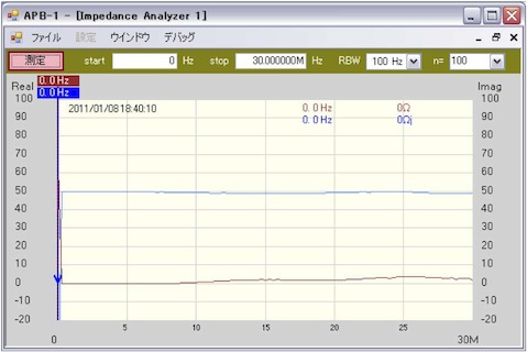 50Ωをインピーダンスアナライザで測定してみた。10MHz以上では、高域のCMRRがわるいせいか、ちょっと荒れている。。。キャリブレーションのやりかた等にもよるかもしれないが、±1Ω以下なので、この程度の測定器としては十分に許容範囲の性能と判断する。