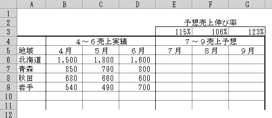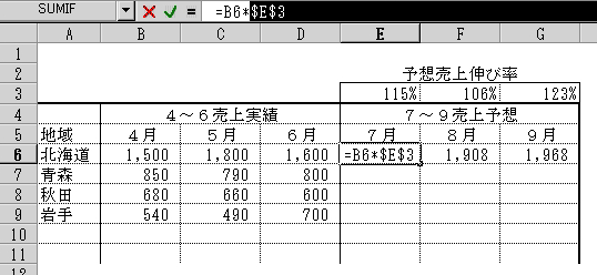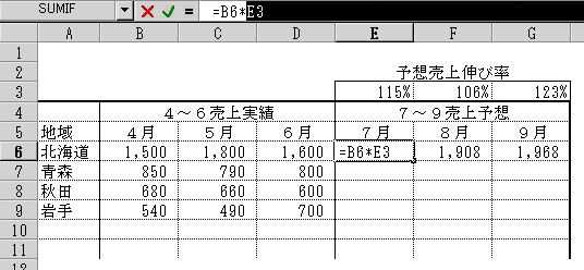 先ほどの例で言えば、北海道の7月の式は、=B6*E3 でしたね。