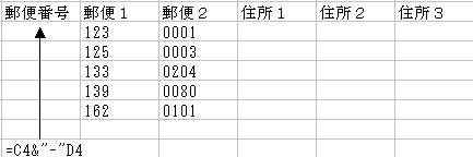 郵便番号の下のセルに、以下のような式を入れましょう。