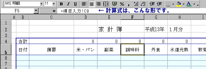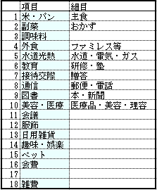 Q.家計簿を作っていたら、ああでもないこうでもないと形が決まらないんです。 みんなが考える家計簿に標準はあるんでしょうか。 A.標準的なスタイルはありますが、これが家計簿だなんていうのは無いですね。 Q.ということは、100人いたら100通りの家計簿ということですね。 ワア、大変。 A.そう、だいたい頼まれても、収拾がつかなくなって勝手に作ったらみたいにな ることって多いんですね。 ならば、半完成状態の家計簿を作って、最後の部分だけ手を入れて完成させる という手法はいかがでしょうか。 ------------------------------------------------------------------------ 家計簿では、 1.支出だけ見ればよいのか。収入との比較も見たいのか。 2.支出項目数はいくつか。 3.支出項目名とその順番 4.できれば、年間のまとめも見たい。 といった要求を満たそうとして、検討するわけです。 今回は2.と3.を解決しましょう。 支出項目を設定するときに、箇々の月ごとに入力していったら大変です。 そこで、支出項目設定用のシートを作ります。−シート名を「項目入力」とします。
