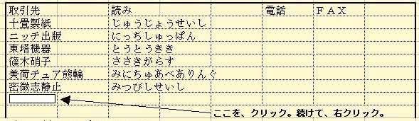 その2 入力データの再利用 Q.売上データをまとめています。 取引先名を入力するのは、結構大変な作業ですが簡便な方法はありませんか。 A.いくつかの方法が考えられます。 あらかじめ、入力する会社数が限定されているのなら、事前に登録しておいて それを参照するのがよいですね。 でも、これは LOOKUP という関数 を使用することになります。 Q.そんな関数なんて!難しいことは止めましょう。 A.も〜っ、関数をいやがってたら、進歩しませんよ。 もう一つの方法は、入力の手間が少し増えますが、イカニモExcelを使って 使っているという気にさせるテクニックです。この表に、続けて入力しましょう。 次の入力は、前に入力した「美荷チュア熊輪」です。 「密微志静止」の下をクリック。続けて、右クリック。 「リストから選択」をクリック。 すると、前に入力した取引先名がリストで画面にでてきます。←五十音順! ここで、「美荷チュア熊輪」をクリック。すると「美荷チュア熊輪」と入力 されます。同じように、「読み」も入力してみましょう。 Q.これは便利ですね。 このテクニックで、注意することはありますか。 A.転ばぬ先の杖ってやつですね。 一つだけあります。このテクニックは、入力されているデータの一番下の次の セルでしか機能しません。だから、一つでもブランクが入ると、もう候補リス トは空白しか表示されません。