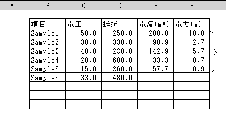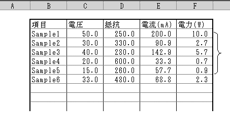 「電流」欄は、電圧を抵抗で割って単位がmAなの1000倍して書式は小数点1位表示