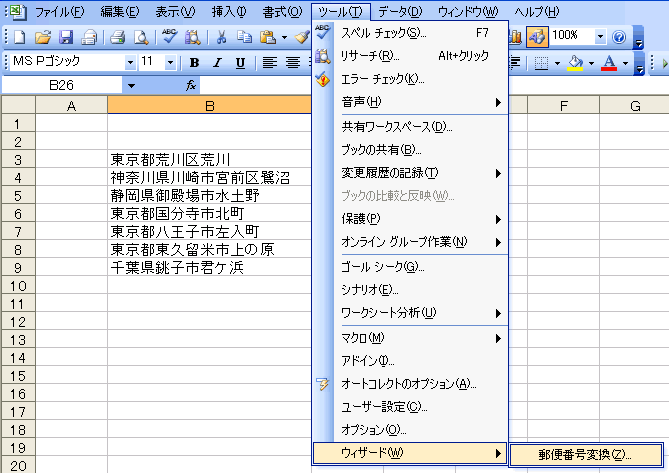 下の図のように郵便番号を調べたい住所を入力しておきます。