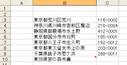 次に、郵便番号を表示させたいセルの先頭をクリックし、データの下まで