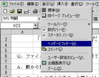 1.「メニュー」「表示」「ヘッダーとフッター」をクリック。