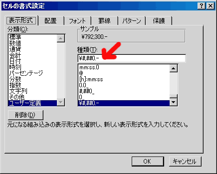 種類(T): の下のボックスの中に、 ¥#,##0.− と入力します。