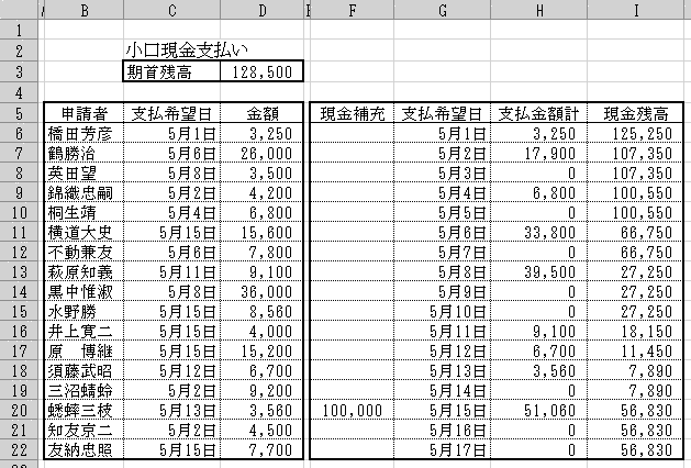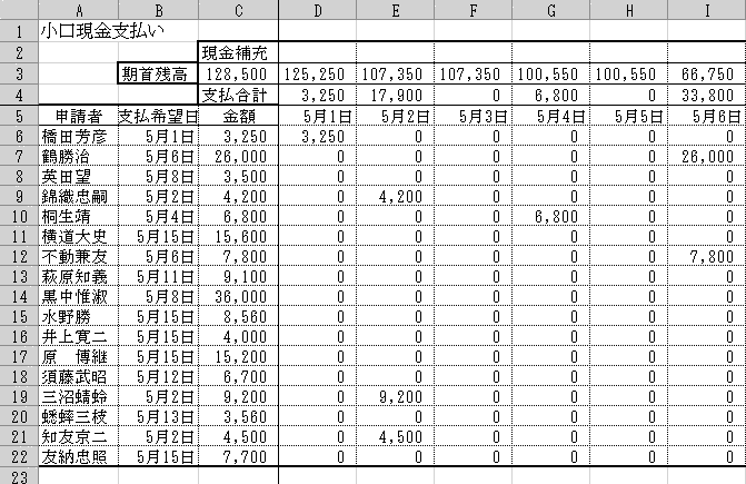 「小口現金の出金予定と現金補充」