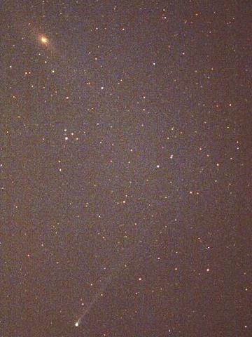 オ−スチン彗星 1989o1 1990年4月25日 4時00分 5分露出 撮影地:高縄山 レンズ:200mmF4 発見時とても明るく、巨大彗星になると言われていた彗星です。太陽に近くなるに連れ、予想よりも暗くなり、太陽接近以降予想をおおいに下回る明るさでした。写真で見ると、細長い尾が見えます。左上の雲のようなものがアンドロメダ大星雲です。低空のためぼんやりとした姿に見えています。