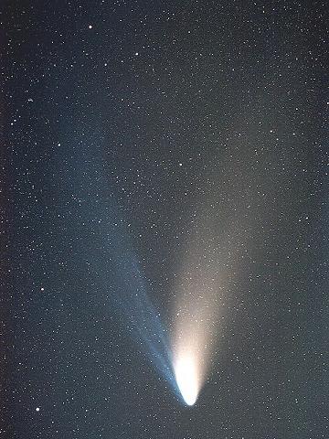 ヘ−ル・ボップ彗星 1995O1 1997年4月7日 19時50分 14分露出 撮影地:双海町潮風ふれあい公園 レンズ:マミヤ150mm F4 4月1日に太陽に最も接近したこの彗星は、4月上旬に最も明るく-1等星となりました。このころは、Vの字に伸びるイオンの尾と、チリの尾がとてもよく見えました。もし、百武彗星と同じくらい地球に接近していたなら、月のように明るく見えたことでしょう。
