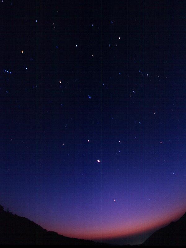 春の宵に浮かぶ三惑星 2000年3月2日 19時02分 3分露出 中山町松森城森林公園で撮影 カメラ:PENTAX MZ-10 17-28mm魚眼ズ−ム 17mmF4.8 フィルム:エクタクロ−ム200 2000年春、宵の西の空には、木星、土星、火星が集まりにぎやかです。中央下よりの一番明るいの星が木星、そのすぐ上に土星、地平線たいへん近く火星、三惑星が一直線に並んでいます。そして、その上には、冬の星座の明るい星々が並んで、たいへん美しい眺めです。