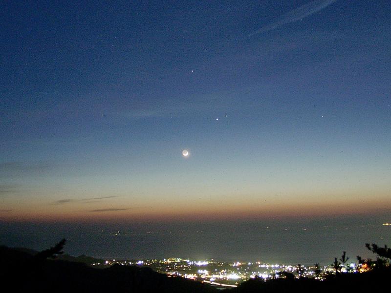 2000年4月、木星と火星が大接近ました。その近くには美しい地球照が光る月が輝きたいへんみごとでした。そして、少し上には土星も輝き、2000年のなかでも有数の眺めです。