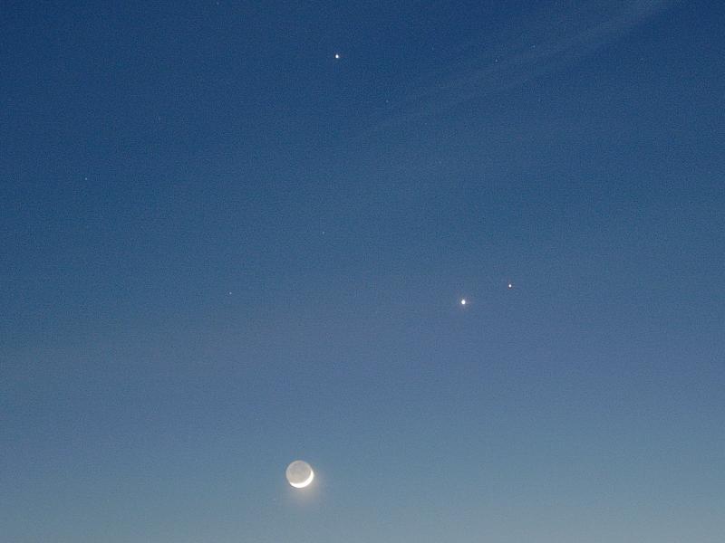 | 月の右上に二つの星が並んでいます。このうち、左側の明るい星が木星、右側の星が火星です。土星は月の上に見える明るい星です。 |