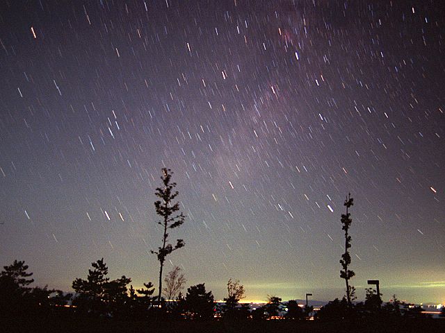 沈む織り姫と彦星 1994年9月13日 25時57分〜5分露出 松山市エリエ−ルゴルフ場で撮影 カメラ:PENTAX MV-1 24mmF2 フィルム:コニカLV400 秋の初めの真夜中、織り姫と彦星が仲良く瀬戸内海に沈んでいきました。ちょうど二本の木が目印となり、右側の木の横に織り姫星、左側の木の横に彦星が見えています。