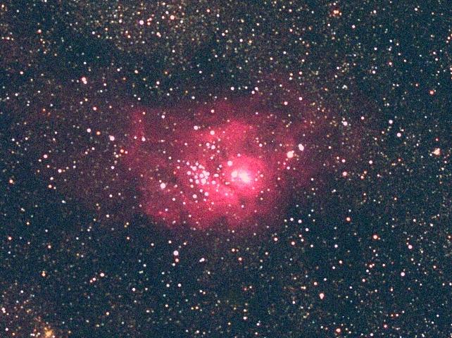 夏の星座いて座にある散光星雲です。別名干潟星雲と呼ばれ、画像で見ると赤い色が特徴です。しかし、デジタルカメラでとらえると青白くなってしまい残念です。この散光星雲は眼視では、色が分かりません。重なる散開星団の星と、白いガスが分かる程度で、写真でないと魅力がありません。7.5cm屈折望遠鏡で撮影