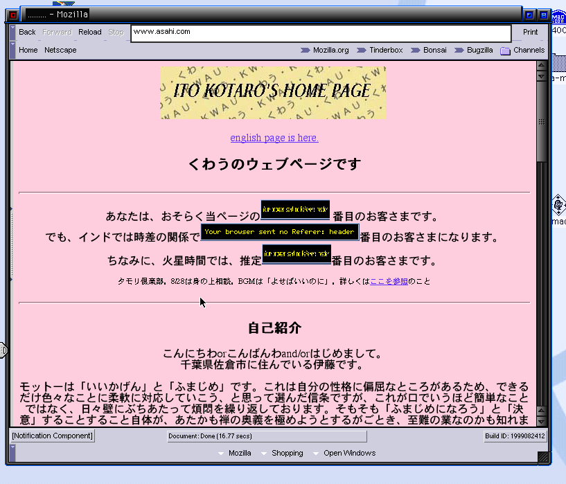 TOP of PAGEMozillaのページからM9をダウンロードした。今回も、ちょっとバグが多いようだ。たとえばMozillaのページに戻らないと終了できないとか、動作が極めて不安定になった。アドレスを指定してそこに行くとか、ブックマークを選んだり、Preferenceを選ぶ時にも、動作が全然きかなくなる場合がある。このあたりはM8より安定性を欠いているような気がする。