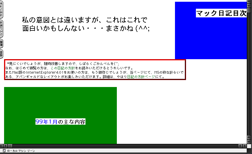 1999年5月の追記:注意! この日記の中のスタイルシートは、Mac版のInternetExplorer4.01で御覧になった時、とても奇妙なレイアウトにしてくれるようです。Mozilla4.5も4.04も3.0も、そしてWindows版IE4.0やMozilla4.0でもこんなひどいレイアウトにはしてくれませんので、これはブラウザの方に問題があるような気がしますが・・・はてさて。