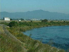 | 豊川は, 豊橋市下条西町および豊川市行明町付近で 大きく左に(南に)曲がります。 手前が行明町(豊川右岸), 対岸が下条西町(左岸)です。 |