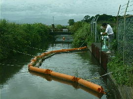 | 豊橋浄水場の職員の方が,牟呂用水の取り入れ口 のゴミをとっています。 牟呂用水自体,水質は良好なのですが, 上流から木の枝をはじめ様々なゴミが流れてくるので, ゴミをとらないと,取り入れ口が詰まってしまうそうです。 また,だいだい色のフェンスは,油の混入を防ぐために あるそうです。 |