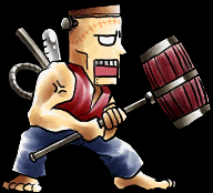 正確にはフランケンシュタイン博士が作った怪物なのであって、怪物本人に名前がないというところがミソ(笑)。似せて描いてみたのになんだか妙なことになってます(爆)。こいつはメディウサ、おおこうもりに続いて魔導五器のひとつ、ONにしておくとSTRが+10される爪を持つボスです。 手に持った巨大ピコピコハンマーで殴ってくる(爆)。それが届かない間合いだったり部屋の端に追い詰められたりした時などには前転体当りで転がってきます。攻撃力は体育会系(?)だけあって30と高め。ピコピコハンマーは振りかぶったらバックダッシュで避け、降り降ろした後にスキができるのでそこを攻撃。前転体当りは2段ジャンプで避けられます。 儂はどんくさいので前転されたら多分避けきれないだろうと踏んで、防御力を重視してわざわざ天井水脈まで行ってチュパカパブラからブリーシンガメン(防+15)をひったくってきて戦いました(爆)。で、めんどくさいので、困ったときのシールドロッド+アイアンシールドをダメージ食らっても無視して遠距離からガンガンぶっ放したら結構ラクにイケました(核爆)。参考までにこのときの儂のステータスはLV52、HP748…参考になりませんね、ハイ(死)。魔導器のを爪を取ったらおしまいです。さっきのセーブルームまで戻ってセーブしておくとよいでしょう。結論。フランケンには力攻めが有効(何じゃそりゃ)。 さっきラッキードラッグを取った所まで出て上に上がります。上がった所のつぼにはライフアップが入っていますので即ゲット。右に見える赤い扉は卑鉱石の廊下に続く入り口だけどここも今はお預け。ここから先、上に上ると凄いスケルトンがいっぱいいるので、霧で抜けて取るものを取ったらすぐ戻りましょうネ。では、その凄いスケルトンとは何なのかをご紹介しましょう。