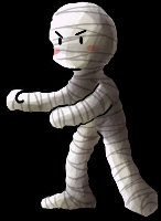 飛び降りた先は部分的に針廊下になるので、スパイクブレイカを装備するか、面倒なら霧で抜けるかしましょう。蝙蝠で抜けようとするとスケルトンジャンパーに飛びかかられて針山の上に撃墜されたとき大変なことになります(苦笑)。廊下の右の突き当たりにはアクアマリンの入ったつぼがあるです。天井に開いた穴から外に出るといい月夜です。ここの直線上には表城時計塔のボスだったマルファスが計3体出現しますが、レベルや攻撃パターンは変わらないので、前と同じ戦法でちゃっちゃとやっつけてしまいましょう(上表参照ナリ)。 ちなみに、マルファス達がいた所の上空はマップがガバガバ空いてしまっているので、ウォークマスターの防御力を上げるためにも霧で埋めましょうネ。で、マップ埋めのついでに左の壁に開いている通路2つにも入ってしまいましょう。下の通路はセーブルーム、上の通路の奥には序盤にデスに取られたアイテムの一つ、アルカードメイルが!防御力では全鎧最強の20(成長するウォークマスターを除く)。早速ゲットですようっ。右の壁にも通路が2つあります。そのうち上の通路の奥にはライフアップがあり、更にその先にデビルとフライングゾンビ3体が出現する部屋がありますが、一番右の燭台があるあたりの床を壊すと中にはハートリペアがあります。そこからまた右へ進むとその先は異端礼拝堂につながっています。さて残る右下の通路が言わずと知れたボス部屋への道。進んで行くと細くて暗い廊下に入ります。廊下が更に狭くなっているところの手前の天井には手裏剣があるのでお忘れなく。で、細い通路は蝙蝠か狼で抜ける、コレはもう分かりますよね。そしていよいよここから先が死翼の間のボス、ミイラ男(何てベタな…)の部屋でごんす。
