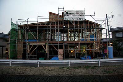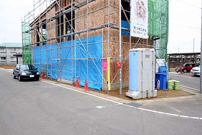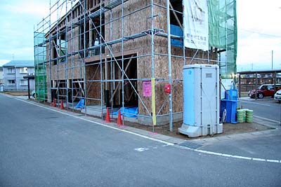 日曜日の朝。工事はやってない。ある程度壁が出来ても開口部が大きいウチの建物、シャッタが入るまでは大穴が空いているので、職人さんが撤収する前に毎日ブルーシートを貼るようになった。