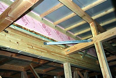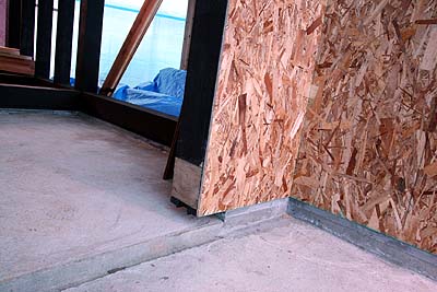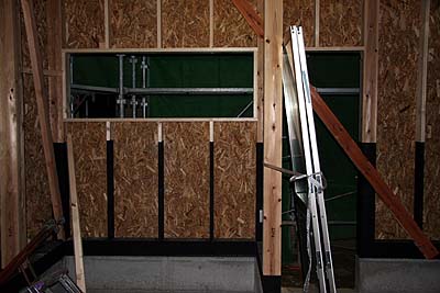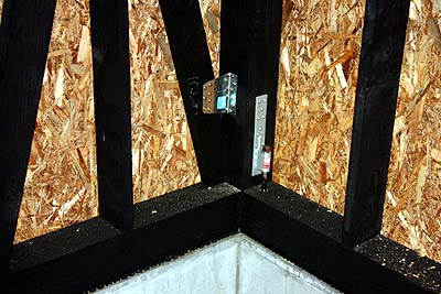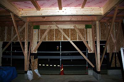 ガレージ内側から。太い梁に更に構造用パネルを貼る。