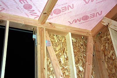2階部分。壁と屋根が重なる部分。外断熱材に隙間が出来ないよう、室内側にオーバラップするようにネオマフォームが張られている。4月18日
