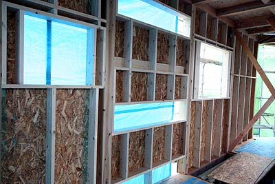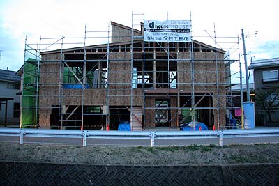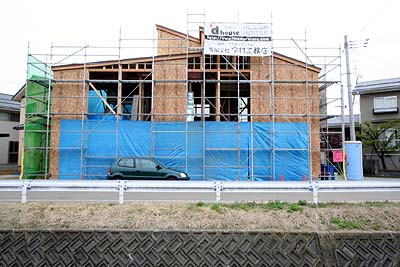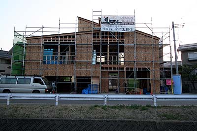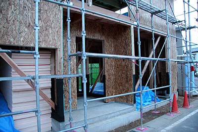 外側の一部に構造用合板の施工が始まっていた。