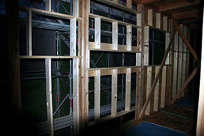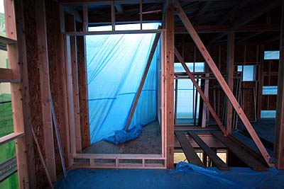 洗面台付近の窓。横長の窓が3つ重なるように上中下と並ぶのだが...? ハテ? 先日の打ち合わせで決めた高さと違うのでは? コレは不味い、このままだと洗面台が成り立たなくなる...(^^;; さっそく担当H氏に電話して確認してもらう。打ち合わせの内容と担当H氏の手元図面は合っているようだが、現場での出来が違う。 現場のミスか? H氏から現場への伝達エラーか?4月20日