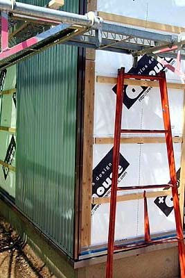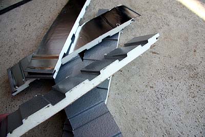 使用する外壁材はこんなの。表はガルバリウム鋼板。中に発泡樹脂系の断熱材入り。裏は赤外線を反射するアルミ箔が貼られている。外壁材の裏に通気層を設ける工法の場合、外壁材の断熱性はあまり意味が無い。しかし、外断熱工法では外壁と外断熱材の間に空間はあるものの、積極的に通気させる構造にはなってないので、断熱効果も有る程度期待出来るかも? が、私がこの外壁材に期待したのは断熱性ではなく、防音性能と耐火性能である。ロックウールなどの壁内断熱材に比べると外断熱材は防音性能が高くないので、外壁で少しでも防音性を高めたかった。