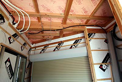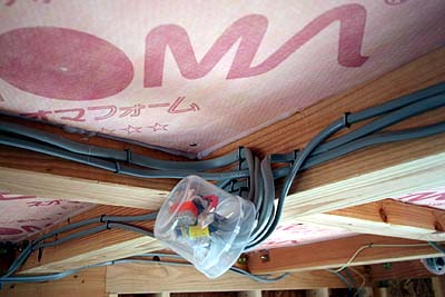 北側開放ガレージの天井。黒い太い線は電柱からの引込み線。電力メータを通って2階中央部の配電盤まで繋がる。通常の外断熱の場合、天井に断熱材は入れないのだが、ウチの場合、1階が全部土間だったり開放ガレージだったりするわけで、2階の床が底冷えしないように1階の天井にもネオマフォームを入れてもらった。