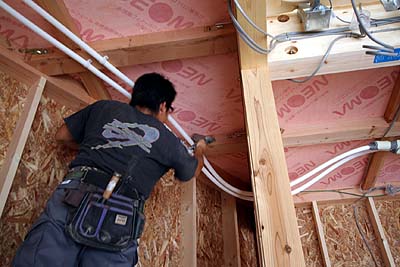 そのままでは気密性が低いため、職人さんが手作業によりすべてのネオマと木材の隙間をシーリングしてくれた。地道な作業ご苦労様でした(^^; 配管や配線を通した隙間は発泡ウレタンで埋めてあった。ここまで気密性を高めると、24時間計画換気って重要になるんだろうな。しかし、隙間を無くして、代わり人工的な隙間風を作るってのも矛盾しているような気も...(^^;;