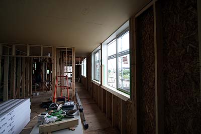 内部は木工事が進み、窓枠がハマって天井の耐火ボードが張られていた。