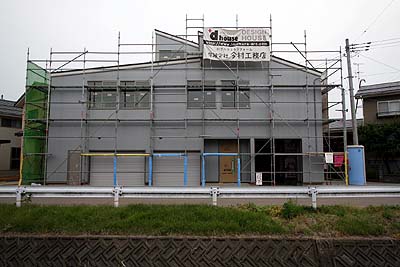 外壁はほぼ完成。北側開放ガレージの内部仕上がまだ途中。北側ガレージが開放なので内部を外壁と同等の処理になる。