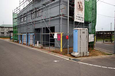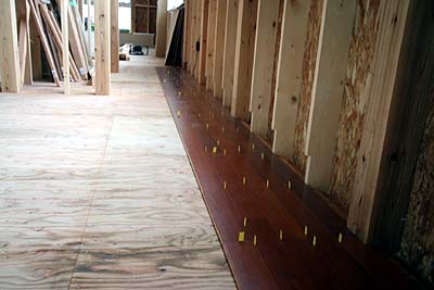 寝室側のフローリング貼りが始まっていた。 コレ、実はちょっとお高いムク材♪当初、普通の合成フローリング材を使う予定だったのだが、ソレと同価格で提供できるお買い得なムク材が在庫で有るとの事で、そのムク材を使う事になった。ところが、予定していた材料の品質が悪く色が揃っていなかった為、急遽変更になった。 予定していたモノに色や素材感が似ていると言う理由でコレになったのだが、予定していたモノよりもかなり高い素材らしい。ソレを建材屋の計らいで予定していたモノと同価格で提供して頂けたとの事。って事は、当初の予定から2段階ほど高級品になってるハズなのだが、価格変更無し(^o^) らっきー♪