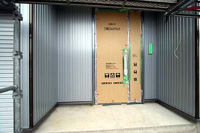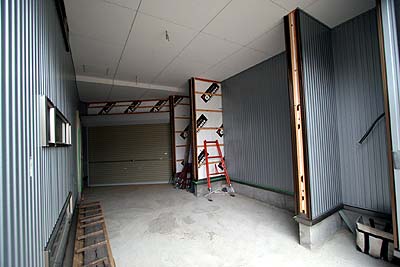 その北側ガレージの中はこうなっていた。天井は耐水性の外部用のボードらしい。奥のほうで天井に段差が有るのは、配管や配線を通す為のスペースを確保したから。