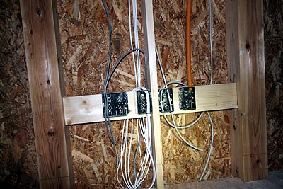 リビングAVスペースの壁。配線にボックスが付いた。サラウンドスピーカ配線が4本、CSアンテナ、UHFアンテナ、LANケーブル、それに100Vコンセントを4口だったかな? これらを設置する高さは一般的な高さよりも高めにした。オーディオボードの裏を覗きながら配線する時に高めの方が楽だから。これ以外の位置のコンセントも割と高めに設置した。マンションやアパートなどは200mmくらいの高さにコンセントが付いているが、常々使いにくいと思っていたので、ウチは400mmくらいの高さに設置した。